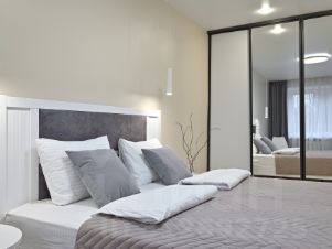 Спальная зона - большая двуспальная кровать с белоснежным постельным бельем, вместительный дизайнерский шкаф.