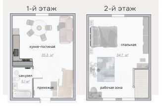 - 1 этаж — прихожая, большой санузел, кухня и гостиная