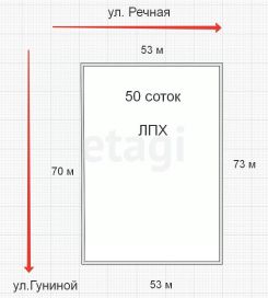 Площадь 50 соток, фасад 72 м (стороны 53/73/53 м).Земли поселений (земли населенных пунктов), Для ведения личного подсобного хозяйства.