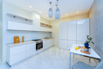 3. Выделенная обеденная зона с барной стойкой и барными стульями. Оборудованная кухня в современном стиле: встраиваемый холодильник, встраиваемая варочная панель, встраиваемая вытяжка, встраиваемая микроволновая печь, чайник, посуда для приготовления, столовая посуда и приборы, кухонные принадлежности.
