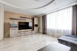 Отделка выполнена в спокойных, благородных оттенках: ламинат высокого класса износостойкости, керамогранит в мокрых зонах, аккуратные обои, комбинированные потолки с точечным освещением — пространство выглядит цельно и дорого.