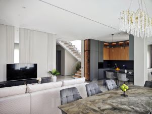 В отделке применены премиальные решения: мрамор, керамогранит, износостойкие напольные покрытия, кухни из шпона. Пространство дополнено камином и продуманным освещением.