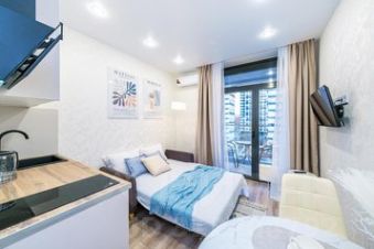 Оборудованная кухня имеет все необходимое : Кухонный стол, стулья, большой диван для отдыха, посуда, бокалы электрический чайник, плита, микроволновка, духовка
