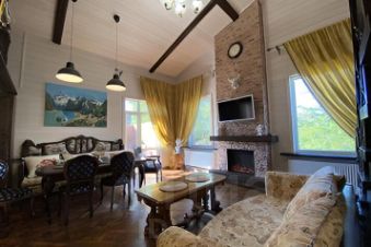 На территории дома есть беседка-мангал ,русская баня на дровах (отдельно стоящее сооружение), детский городок, теннисный стол(летний период ), караоке ,интернет, камин.