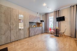 -Кухонная зона с холодильником, микроволновкой, индукционной плитой, полным комплектом посуды.