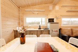 В доме: двуспальная кровать с ортопедическим матрасом, 2 комплекта постельного белья, полотенца: банное - 2 шт., для рук - 2 шт., для ног - 2 шт. Кухонный гарнитур и обеденная зона, стулья, чайник электрический, индукционная плитка, кастрюля и сковорода, микроволновая печь, холодильник, посуда и приборы на 2 персоны, средство для мытья посуды и губка. Комод для вещей. Душ, туалет, шампунь, гель для душа и жидкое мыло, фен, водонагреватель, обогреват
