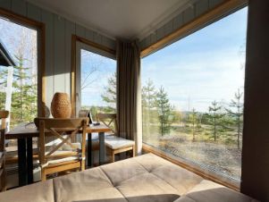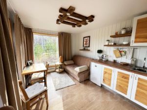 На территории 5 домиков. Все домики отапливаются и имеют все удобства. Коттеджи располагают мини-кухней, гостиной зоной с диваном, столом и телевизором, а также ванной комнатой с ванной/душем.