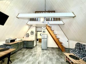 - Обстановка: Уютная гостиная с окном на лес, раскладным диваном, совмещенная с кухней и обеденной зоной.