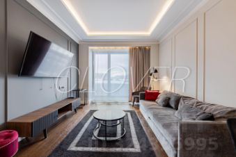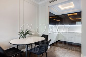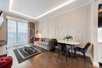 Основное пространство соединяет в себе прихожую со встроенной зоной хранения, столовую с кухонным островом, кухню, гостиную с мягкой группой и кабинет с рабочим местом — и все это с видом на внутренний парк комплекса через панорамные окна. Вся мебель в проекте, за исключением дивана by PIGO и обеденных стульев AVA by Song Wen Zhong от Roche Bobois, выполнена по эскизам заказчика. Напольное покрытие из керамогранита, стены и потолок покрашены. Кухня полностью скрыта за складывающимися дверьми, но при этом нижняя часть ящиков и холодильник остаются в доступе. Кабинет с рабочим местом находится за складными дверцами в мебельном исполнении.