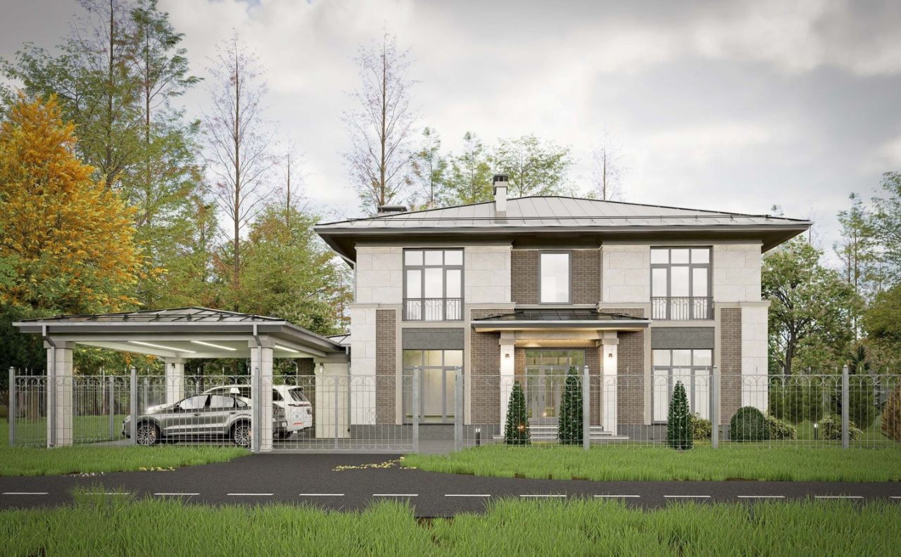 S-324. Это проект двухэтажного статусного дома со вторым светом и четырьмя спальнями. Серьёзное строение для большой семьи, которая ценит стиль и комфорт. Проектировщики предусмотрели отдельное место для двух автомобилей под навесом. Оставляем машину и проходим в дом.