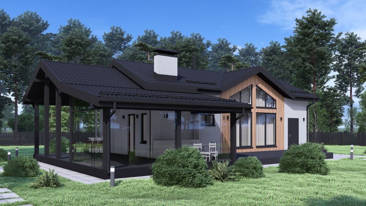 S-93. Вашему вниманию – проект банного домика, который отлично впишется на участок в качестве самостоятельной постройки. И главное, здание это многофункциональное, так как помимо бани может выступать и гостевым домом. Сама парная с техническим помещением, помывочной и санузлом находится в левой части строения. В центре – большая гостиная, выступающая в том числе и буфером между баней и жилой комнатой. Соответственно, в правой части и находится та самая спальня, которая отлично подойдёт для гостевого размещения. Большим преимуществом проекта является наличие террасы, часть из которой защищена навесом. То есть даже дождь в теории не сможет помешать времяпрепровождению в приятной компании.