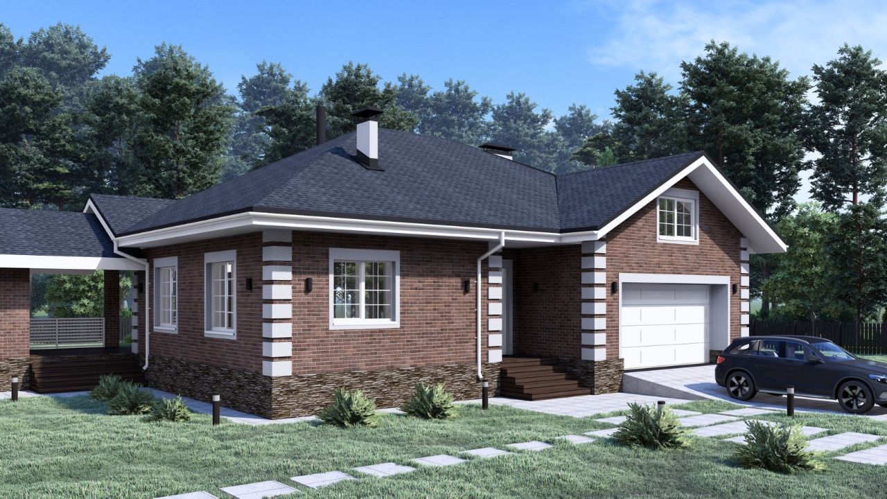 S-257. Этот дом представляет из себя просторный одноэтажный коттедж с гаражом на два автомобиля. Статусный внешне и уютный внутри, этот дом станет отличным выбором для семьи с двумя детьми.