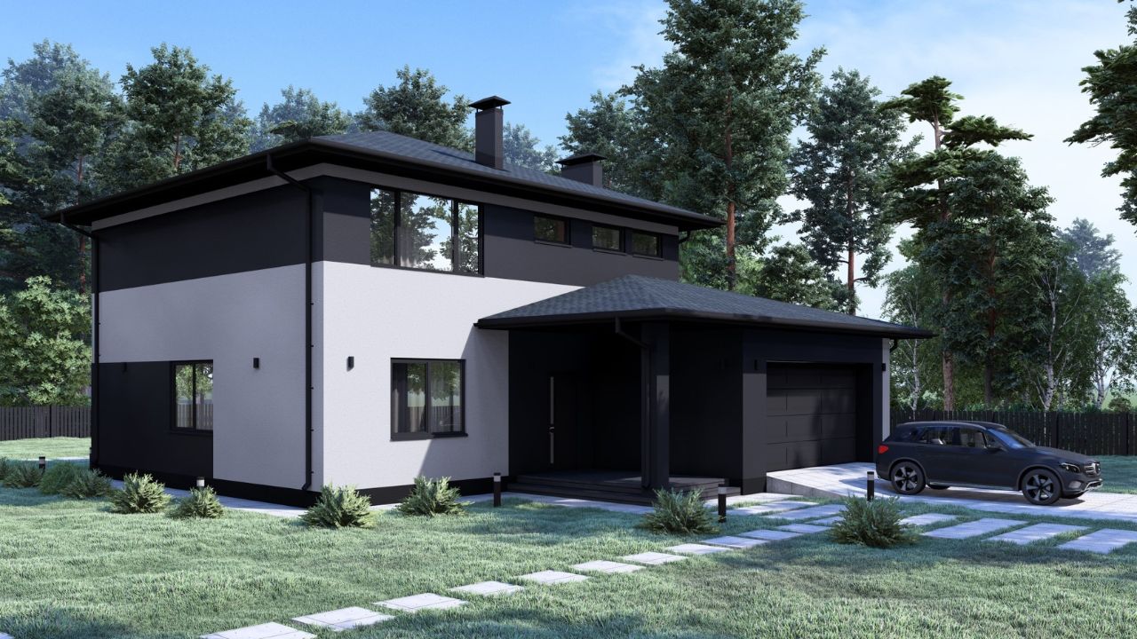 S-216. Перед нами строгий и стильный двухэтажный дом с гаражом на две машины. Жилой площади этого коттеджа хватит на семью с двумя или даже тремя детьми, где у каждого будет как своё личное пространство, так и возможность совместного времяпрепровождения в семейном кругу.