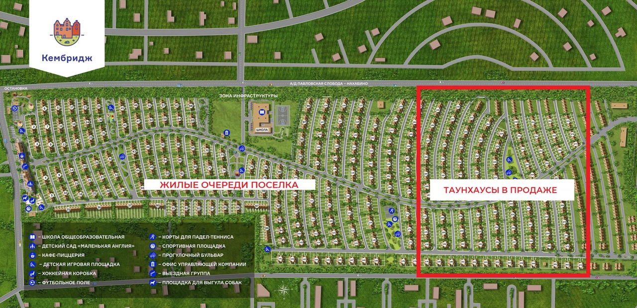 Коттеджный посёлок «Кембридж» – таунхаусы бизнес-класса и превосходная инфраструктура, обеспечивающая уровень комфорта, привычный жителю мегаполиса. Поселок расположен на 23 км Новорижского шоссе. Общая площадь 70 Га, 2400 домовладений. На данный момент «Кембридж» застроен более чем на 90%, сданы 11 очередей, более 1500 семей постоянно проживают в поселке. Все коммуникации центральные: газ, вода, канализация, электричество. Основой архитектурной концепции посёлка «Кембридж» послужили уютные городки Старой Англии. Фасады таунхаусов меняются от традиционных краснокирпичных с белым декором в первых очередях застройки до современных домов в стиле лофт с панорамными окнами. Уходящие в небо шпили и стрельчатые арки встретят Вас уже на подъезде к посёлку – въездная группа «Кембриджа» выглядит как настоящий старинный замок. Площади таунхаусов от 64 м2 до 182 м2 (два этажа + мансарда с полноценной высотой потолков). Материал стен - кирпич премиум-качества Porotherm, облицовочный кирпич Kerma Premium. Каждый таунхаус имеет два парковочных места перед входом. Инфраструктура посёлка «Кембридж» – здесь есть всё, что нужно для проживания круглый год. Завершается строительство школы. Работает детский сад «Маленькая Англия» с группами по системе Монтессори и разнообразными дополнительными занятиями для развития и подготовки к школе. В «Кембридже» пять прогулочных бульваров с детскими игровыми площадками для маленьких жителей разного возраста и эффектным озеленением. Построены спортивные объекты: футбольное поле с искусственным покрытием, хоккейная ледовая коробка и баскетбольная площадка, корт для падел-тенниса, несколько воркаут-зон, кольцевая беговая дорожка 400 м со специальным покрытием, настольный теннис и мини-футбол. В поселке находится падел-клуб Nevel. К услугам жителей посёлка богатая инфраструктура окружающих территорий. В шаговой доступности несколько супермаркетов. В паре минут езды на авто торгово-развлекательные комплексы и рестораны, в том числе Novaya Riga Outlet Village, фитнес-клубы, салоны красоты и SPA, предприятия бытовых услуг. Поселок «Кембридж» – превосходное сочетание плюсов загородной жизни и городского комфорта.