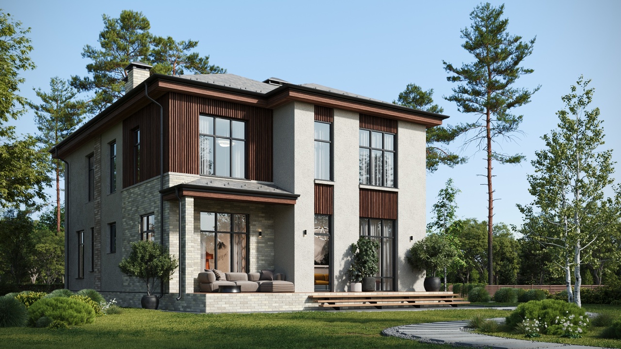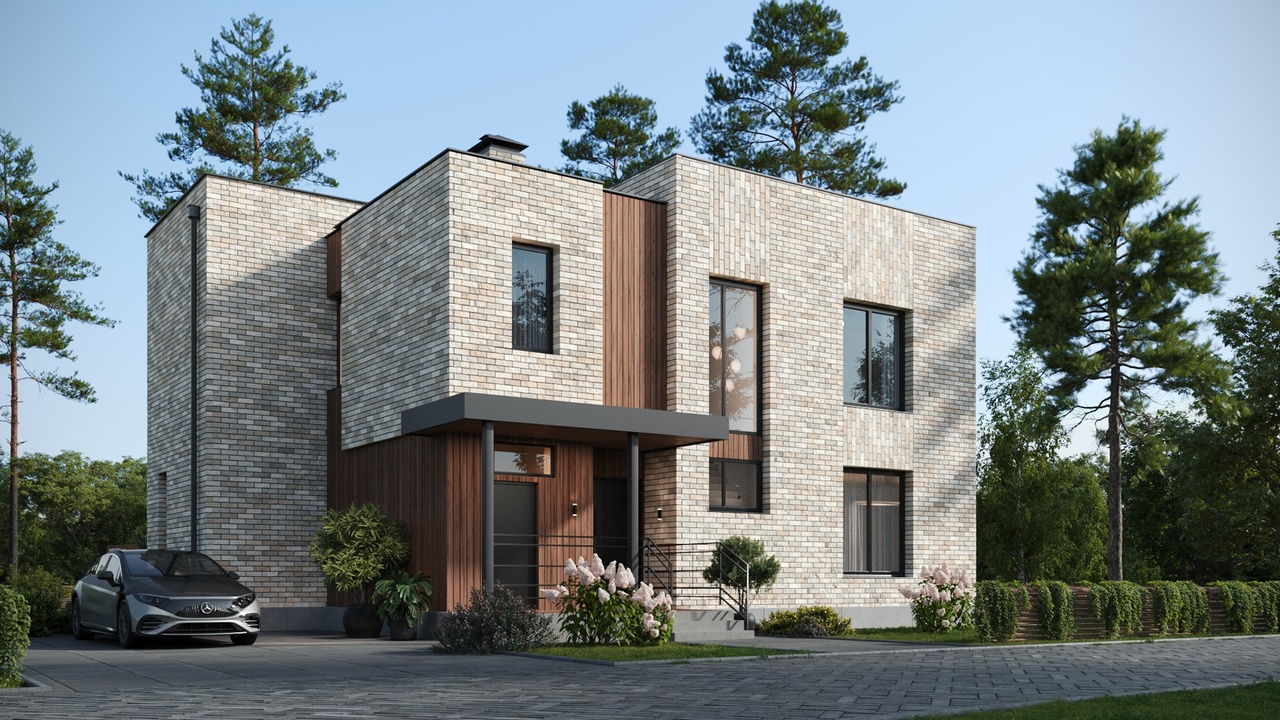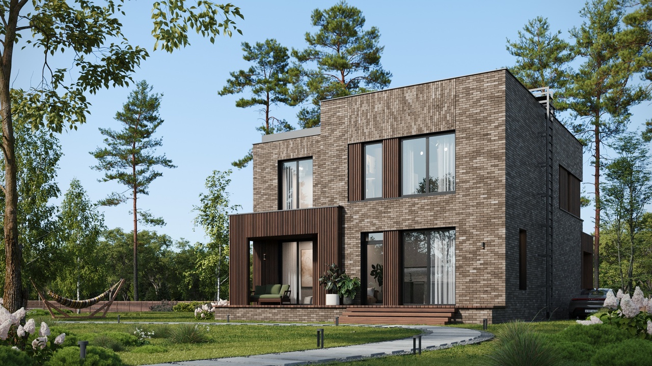 В основе концепции посёлка – органическая архитектура Ф. Л. Райта. Простая геометрия, максимум естественного освещения, природные фактуры и оттенки, использование в строительстве экологически чистых материалов: кирпич ручной формовки, натуральное дерево.