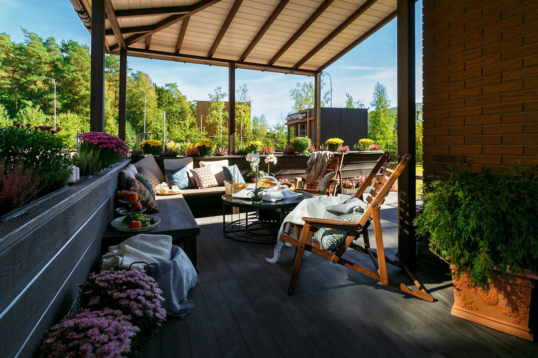 Панорамные окна в пол позволяют построить террасу с выходом из гостиной. Материал стен - кирпич Porotherm, облицовочный кирпич Kerma Premium.