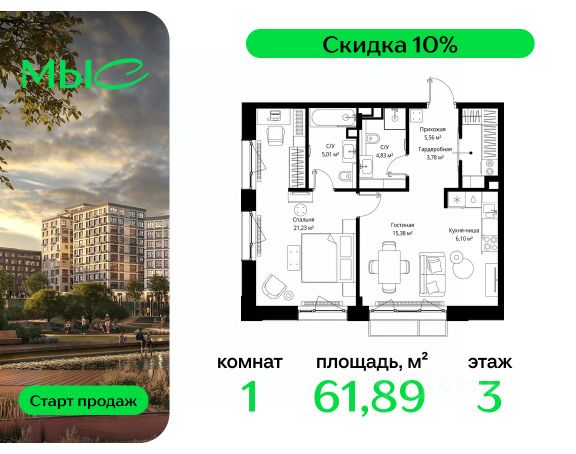 Прямая продажа от застройщика. Продаётся 1-комнатная квартира общей площадью 61.89 м² без отделки в премиальном жилом комплексе "МЫС" на 3-м этаже 12 этажного дома. Квартира расположена в корпусе "Волга". Проект МЫС — это, прежде всего, идеальное место для семей. В рамках проекта построят государственную школу, два детских сада и дворец спорта площадью 20 000 м2 с термальным комплексом, выплывным бассейном, фитнес-залом, теннисными, сквош и падел кортами и секциями для детей. На территории площадью, сравнимой с тремя парками Зарядье, появятся кафе и рестораны, пруд с набережной, спортивные и детские площадки, скейт-парк, лыжные и веломаршруты. Расположение: - 2 минуты до скоростной трассы М1 и Минского шоссе; - 10 минут до МКАД; - 15 минут до МЦД Лесной Городок - 20 минут до делового центра "Москва-Сити"; - 28 минут до аэропорта "Внуково". Благоустройство: - велосипедные и лыжные маршруты; - собственная набережная и парк; - лаунж-зоны в окружении природы; - беседки у очага; - дворец спорта площадью 20 000 м²; - термальный комплекс с тремя бассейнами; - 4 теннисных и падел-корта; - 6 сквош-кортов; - многофункциональный спортзал; - скейт-парк; - просторная площадь для прогулок с фонтаном; - детский клуб с творческими секциями; - гастро-доминанта; - кафе у пруда, рестораны, ритейл. Окружение - соседство с лесным фондом; - школа на 1250 мест и 2 детских сада на 350 и 255 мест; - Дубковский и Подушкинский леса, парк "Рассказовка", Мещерский парк.Действуют специальные условия при 100% оплате, подробности уточняйте у менеджера в офисе продаж. Продается 1-комнатная квартира 60 м2 в Московской области.