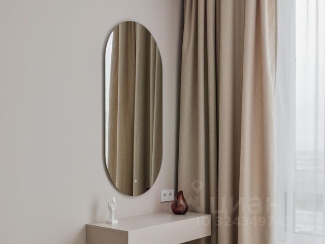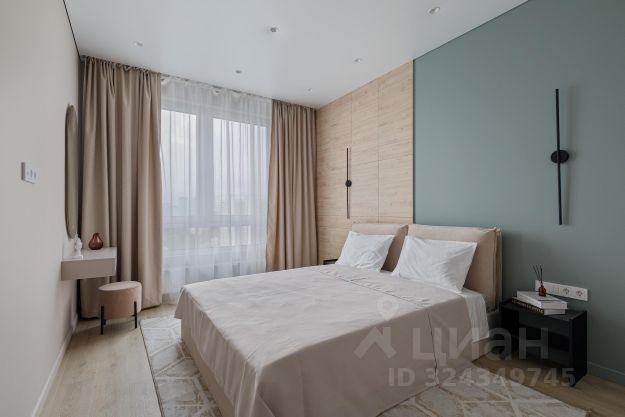 В спальне площадью 13,9 м² — двуспальная кровать с ортопедическим матрасом, подъёмным механизмом и местом для хранения, вместительные платяные шкафы, подвесная полка с зеркалом и пуфиком