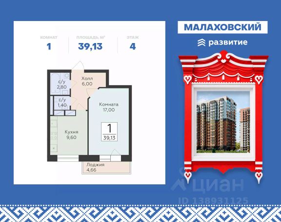 Продается 1-к квартира площадью 39.13 кв. м с черновой отделкой. Квартира расположена на 4 этаже 19 этажного дома, в 201 корпусе. "Малаховский" - жилой комплекс в Раменском районе Подмосковья, идеально подходящий для семей с детьми. Проект от федерального застройщика ГК "Развитие" находится в тихом и зеленом микрорайоне Родники и отличается удобной транспортной связью с Москвой и Люберцами. Три дома высотой 17 этажей с видами на озеро и парк, просторные квартиры, приватный двор-патио с ландшафтным дизайном и доступная инфраструктура обеспечат жителям новых квартир все преимущества городской жизни в живописном природном окружении. Транспортная доступность - Удобный выезд на Егорьевское шоссе и строящуюся магистраль МЕТК (Москва - Егорьевск - Тума - Касимов); - 18 км от МКАД; - 5 мин. до МЦД-3 "Удельная"; - 29 мин. до метро "Лермонтовский проспект". Архитектура Дома отличаются высокой тепло- и шумоизоляцией, долговечностью, высоким уровнем энергоэффективности и современным внешним видом. Фасады выполнены в спокойной цветовой гамме. Из окон с широкоформатным остеклением открываются виды на березовую рощу, озеро и зеленые дворы. Логичным продолжением архитектуры становятся просторные входные группы, где продумано всё: витражное остекление, высокие потолки, дизайнерская отделка, два выхода на обе стороны дома, а также современные лифты (грузовой и пассажирский) и колясочные. Планировочные решения Планировки комплекса "Малаховский" функциональны и эргономичны, что упрощает зонирование и расстановку мебели. Квартиры оснащены гардеробными, лоджиями с панорамным остеклением, двумя санузлами (даже в однокомнатных) и просторными прихожими. Высота потолков - 2,7 м. Квартиры сдаются с отделкой white box, которая позволит воплотить индивидуальный дизайн-проект по своему вкусу. Доступны варианты отделки "под ключ" с применением лучших дизайнерских материалов. Благоустройство В жилом комплексе тщательно продумана концепция благоустройства. Через всю территорию тянутся живописные прогулочные бульвары с ландшафтным дизайном и всесезонным озеленением. Рядом обустроено 3 современных детских площадки с мягким покрытием, а для взрослых предусмотрены уютные лаунж-зоны для общения, тихого отдыха и спорта на свежем воздухе. Двор каждого дома свободен от машин, а для дополнительного уюта и безопасности здесь установлено современное освещение. Естественным продолжением дворового ландшафта становится березовая роща с природными тропинками и небольшим водоемом, прилегающая к жилому комплексу. Инфраструктура и окружение - Наземный паркинг на 55 машино-мест и гостевая парковка; - Все повседневные сервисы (кафе, магазины, салоны красоты) прямо в вашем доме; - Фитнес-клуб, бассейн, спортивные площадки и велодорожки в многочисленных парках микрорайона Родники; - 2 школы, гимназия и детский сад в шаговой доступности; - ТЦ "Родники" с рестораном и супермаркетом; - Петропавловский парк с благоустроенным детским городком и волейбольной площадко