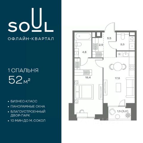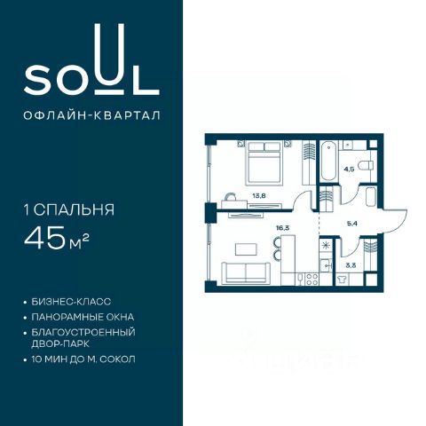 Цены указаны с условием 100% оплаты и стандартной ипотеки. Прямая продажа от застройщика! Продается 1-к. квартира номер 91 общей площадью 44.8 кв.м. на 3-м этаже 8 этажного дома, корпус UNIQUE (премиум-класс). Без отделки. Проект бизнес-класса SOUL от девелопера FORMA. До метро Сокол 10 мин пешком. Архитектура от британского бюро SimpsonHaugh. Благоустройство дворов — Gillespies и GAFA. Территория состоит из культурного парка и приватных дворов. Озеленение в эстетике лесного оазиса. Насыщенное благоустройство: прогулочные тропинки, релакс-зоны, пряный и сенсорный сады, развивающие детские площадки и воркауты. В центре проекта объект культурного наследия — общественное пространство Изофабрика, построенная в 30-х годах по проекту архитектора Георгия Гольца. Здесь будут располагаться мастерские для взрослых и детей, выставочные залы, коворкинги, образовательный центр, рестораны и кафе. Квартиры с панорамными окнами, мастер-спальнями, гардеробными, классическими балконами и лоджиями, видовыми террасами. Высота потолков от 2,9 до 3,5 м. В проекте 2 детских сада на 100 и 200 малышей. Клубная гостиная, фитнес-рум, детская игровая комната, дизайнерские лобби, подземный паркинг и келлеры.