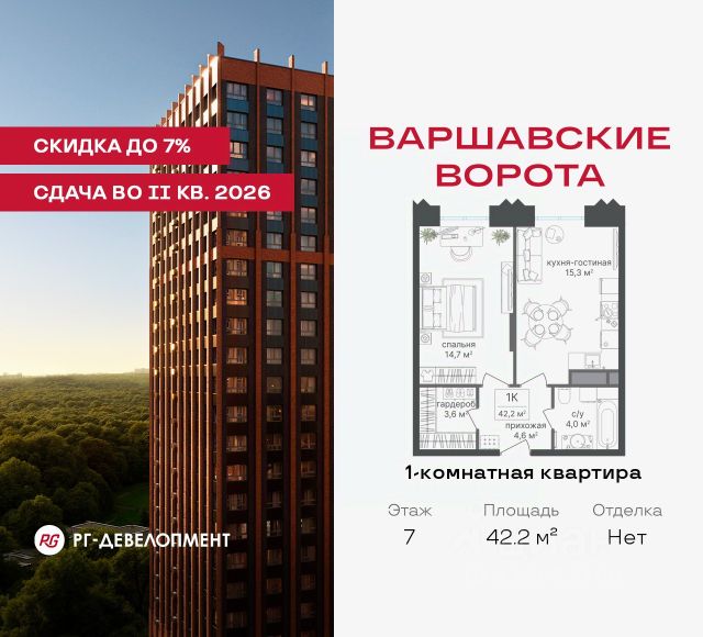 Рассрочка 0% + скидка 5%. Первый платёж 50% при ДДУ, второй 50% — через 12 мес. до ввода ЖК. Продаётся 1-комнатная квартира 35.8 кв.м. в МФК "Варшавские ворота" на 7-м этаже 30 этажного дома. МФК "Варшавские ворота" — это точка баланса между природой и городом, стилем и функциональностью, жизнью сегодня и устойчивым будущим. Коротко о важном: - 1 минута пешком от м. Аннино; - Удобные выезды на Варшавское шоссе и МКАД; - Высота потолков 2,7 - 3 м; - Закрытый двор-парк; - Школы и детские сады в 10-15 минутах пешком от дома; - Технические лоджии для размещения кондиционеров; - Подземный паркинг; - РГ-Девелопмент — ТОП-20 крупнейших застройщиков Москвы. Проект сочетает в себе современную архитектуру и продуманное благоустройство с уникальным природным окружением. Всего в нескольких минутах от дома — девять парков, каскад прудов и крупнейшие лесопарковые зоны Москвы, создающие ощущение жизни в зеленом оазисе посреди мегаполиса. Архитектурная концепция - стиль Чикаго в Москве. Фасады облицованы вентфасадами под клинкерную плитку. Фасады подчеркивают строгие линии и современный стиль, а входные группы разработаны московским бюро Синтаксис. Вестибюли оформлены с применением керамогранита, декоративной штукатурки и гипсовых панелей, детали из латуни добавляют изысканности. Проект находится в 1 минуте пешком от метро "Аннино", в 12 минутах от станции "Улица Академика Янгеля" и рядом с МЦД-2 "Красный Строитель". Для автомобилистов предусмотрен прямой выезд на Варшавское шоссе и два съезда на МКАД, что позволяет быстро добираться в любую часть города. Среди планировочных решений представлены разнообразные форматы: от функциональных студий до просторных 4-комнатных квартир и апартаментов. Высокие потолки усиливают ощущение простора, а продуманные планировки включают мастер-спальни, гардеробные, объединённые кухни-гостиные и несколько санузлов. Центральное пространство комплекса — закрытый двор без машин. Он разделён на функциональные зоны: детские игровые комплексы, спортивные площадки и уютные места для тихого отдыха. На первых этажах разместятся магазины, кафе и сервисы, что позволит решать повседневные задачи, не покидая территорию комплекса. Для семей с детьми предусмотрен частный детский сад на 50 мест. Подземная парковка и кладовые обеспечат удобство хранения и безопасность автомобилей. Комплекс окружён девятью парками и лесопарками, каждый из которых обладает своей атмосферой. Выйти на пробежку в Аннинском лесопарке, насладиться прогулками по аллеям в Битцевском лесу, спланировать пикник или велопрогулку в Покровском парке, любоваться каскадом Кировоградских прудов. Всего в двух станциях — музей-заповедник "Царицыно" с дворцами, фонтанами и живописными пейзажами. Здесь каждый житель найдёт своё любимое место для отдыха. Южное Чертаново - район развитой инфраструктурой, где сочетаются городские удобства и природное окружение. В шаговой доступности находятся школы, детские сады, спортивные комплексы и торговые