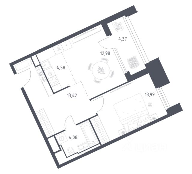 Эта однокомнатная квартира площадью 39,87 м² — идеальное решение для тех, кто хочет создать пространство своей мечты с нуля, не тратя время на выравнивание стен, замену стояков или прокладку коммуникаций.