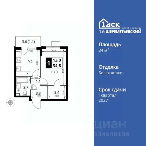 УСПЕЙ ПО СЕМЕЙНОЙ ИПОТЕКЕ БЕЗ НАЦЕНКИ! Квартиры в готовом квартале от 30 000 рублей в месяц! Прямая продажа от застройщика! Жилой Комплекс класса Комфорт Плюс. Продаётся 1-к квартира номер 1236 общей площадью 34.2 кв.м. на 7-м этаже 17 этажного здания. Без отделки. Особенности квартиры: - Линейная планировка - максимальная функциональность и удобство. - Увеличенная ширина окна/окон - больше света и визуального простора. - Можно оборудовать рабочее место - комфорт для работы и учёбы. - Лоджия - уютное место для отдыха и тишины. Информация о комплексе: ЖК 1-й Шереметьевский расположен в самом центре Подрезково, от него всего 6 минут пешком до одноименной станции ж/д и планируемой к открытию МЦД-3. В комплексе яркие и уютные, лобби, большая колясочная, лапомойка. Благодаря гостевому санузлу на 1 этаже прогулки станут по-настоящему долгими. Два лифта пассажирский и грузовой.Во всех корпусах 1-го Шереметьевского там устроены кладовые, а в корпусах 3-5 есть подземный паркинг. В ЖК 1-й Шереметьевский разнообразие площадей и планировок. Большие кухни-гостиные: в них два окна или больше. Во всех квартирах площадью от 40 кв.м. и выше спроектировано 2 санузла. Большие остекленные лоджии с отделкой. Система Умная квартира, реализованная в 1-м Шереметьевском. В каждой квартире установлены датчики протечек и запорные вентили с электроприводом, которые самостоятельно перекрывают воду в случае аварии. Мобильное приложение управляет группами электропотребителей: даже если вы забыли утюг включенным, можно обесточить его дистанционно. Транспортная доступность: - Общественный транспорт: До ближайших станций метро Планерной и Войковской около 40-50 минут на автобусе. 6 минут до ЖД станции Подрезково (МЦД-3) - Личный автотранспорт: Удобный выезд на Ленинградское шоссе позволяет быстро добираться до МКАДа и в центр Москвы, до платной трассы М11 и в аэропорт Шереметьево. 3 минуты до Ленинградского ш. 10 минут до платной трассы М11 15 минут до МКАД 20 минут до ст. м Войковская 25 минут до ст. м Планерная Внутренняя инфраструктура: 1-й Шереметьевский не только сокращает время, которое вы будете проводить в дороге. Но и предпринимает многое, чтобы вы меньше ездили и чаще ходили. На первых этажах корпусов разместятся фрешмаркеты и пункты выдачи маркетплейсов, салоны красоты и химчистки, кофейни и пекарни всё, что необходимо изо дня в день, но не заслуживает отдельной поездки на машине или такси. В квартале будут построены собственные школа и детский сад. Школа рассчитана на 1100 учеников. В ней будут 25-метровый бассейн и просторный атриум, медиатека. Детский сад рассчитана на 400 малышей. Здесь стильный дизайн и комфортные группы, большой физкультурный зал и просторный зал для занятия музыкой. Дворы без машин. Безопасные детские площадки. Вдоль корпусов организованы зоны тихого отдыха: детский гомон с далеких каруселей и горок не достигнет окон жителей. В квартале спроектирован закольцованный веломаршрут с пон