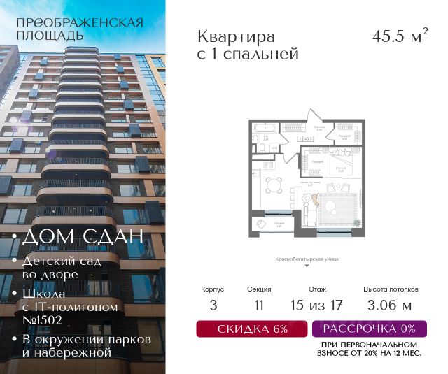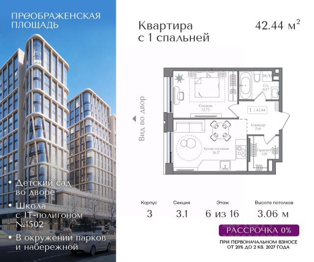 Квартира на 13 этаже в жилом комплексе премиум-класса "Преображенская площадь". Общая площадь: 37.8 кв.м. Проект премиум-класса в историческом районе Москвы. До метро "Преображенская площадь" 3 минуты пешком. Квартиры сдаются без отделки и в свободной планировке, чтобы жители могли оформить пространство с учетом своей индивидуальности. Высота потолков от 3,15м, широкоформатное остекление, 3-5 квартир на этаже. Система Умный дом. Дизайнерские лобби. Внутренний двор 1,5 га функциональное и безопасное пространство для игр, работы и занятий спортом. Пешеходный променад для прогулок. Дома переменной этажности. Есть подземный паркинг. Жилой комлекс находится в окружении парков Сокольники, Черкизовский, Измайловский, заповедника Лосиный остров и ВДНХ, а также вблизи пешеходной набережной. Комфортная удаленность от центра: 7 минут на автомобиле до ТТК, 8 минут до Садового кольца, 25 минут до Кремля.