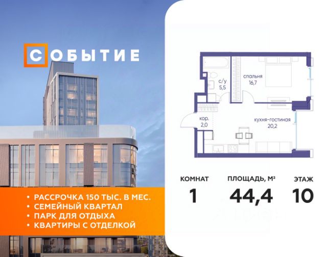 В продаже 1-к квартира от застройщика. Общая площадь 39.30, жилая 14.10, кухня 17.3. Квартира расположена на 12 этаже жилого квартала "Событие-6", корпус 1, Секция 1. Квартира без отделки. Срок сдачи: 4 кв. 2029 года. СОБЫТИЕ.6 — финальный дом парк-квартала СОБЫТИЕ на Мосфильмовской. Переезжайте в уже сформированный квартал с готовой инфраструктурой и парком! Премиальный жилой комплекс в престижном районе Москвы предлагает стильную архитектуру, продуманное благоустройство и великолепно разнообразие общественных пространств. Свой парк прямо возле дома! Архитектура Архитектура СОБЫТИЯ.6 выполнена в ультрасовременном стиле московским бюро Atrium на основе дизайн-кода британских архитекторов LDA Design и UHA London. Дом отличает оригинальная геометрия фасадов, большое остекление и высокие лобби (до 6,2 м) с авторской мебелью и светильниками. Расположение Мосфильмовская улица (Раменки) — один из престижных районов Москвы. Близость к историческому и деловому центру, природным зонам Запада столицы. Транспортная доступность: • 10 мин до Москва-Сити и ТТК; • 15 мин до Садового кольца; • 25 мин до аэропорта Внуково; • 7-10 мин до станций метро "Аминьевская" и "Мичуринский проспект". Инфраструктура: • парк "Событие" (12 га, финалист конкурса Правительства Москвы) с беговыми (1,5 км) и велодорожками (2,7 км), экотропой (1,6 км), площадками, лекторием; • школа, детский сад, магазины, салоны красоты, рестораны (к моменту заселения); • мультидвор с игровыми и спортивными площадками, мини-бульваром; • общественная терраса на 10-м этаже (коворкинг, лаунж); • Закрытые общественные пространства: детская комната, спортивный зал, коворкинг, лаунж-зоны. Паркинг 256 мест для жителей (48 — для электромобилей), 24 гостевых (5 — для электромобилей), мойки колес, кладовые, зоны для велосипедов. Окружение Парки и заповедники (Воробьёвы горы, Матвеевский лес и др.), МГУ, театр им. Н. И. Сац, стадион "Лужники". Безопасность Видеонаблюдение, контроль доступа, видеодомофоны, консьерж-сервис 24/7, системы пожарной безопасности и мультисервисная оптическая сеть.