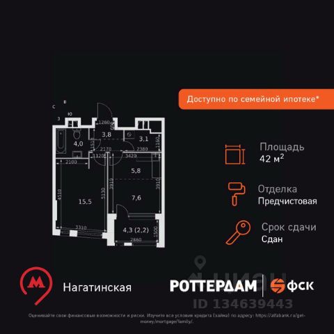 Прямая продажа от застройщика! Жилой Комплекс бизнес-класса на набережной возле Нагатинского причала. Продаётся 1-к квартира номер 82 общей площадью 42.6 кв.м. на 12-м этаже 29 этажного здания. Предчистовая отделка. Цена с учётом скидки. Особенности квартиры: - Организуем показ в удобное для вас время! - Мастер-зона с гардеробной. Просторное место для отдыха и удобного хранения вещей. - Линейная планировка - максимальная функциональность и удобство. - Линейная планировка - максимальная функциональность и удобство. - Увеличенная ширина окна/окон - больше света и визуального простора. - Просторная ванная - место для расслабления и уединения. - Постирочная - организуйте пространство для стирки и сушки вещей. - Евроформат - просторное и удобное жилье с отличной планировкой. - Гибкая планировка - создайте пространство по своему вкусу. - Гардеробная - удобство для хранения и организации вещей. - Просторная лоджия - идеальное место для уютных вечеров. Квартира с предчистовой отделкой. Вам не придется заниматься черновыми и трудоёмкими работы, а чистовую отделку и дизайн - сделайте на свой вкус. Информация о комплексе: ЖК "Роттердам": идеальная транспортная доступность для любого настроения. Пешая доступность до метро, удобный выезд на Варшавское шоссе к ТТК и Садовому кольцу, а также живописная Нагатинская набережная с маршрутом до Кремля. Выбирайте метро, автомобиль, трамвай или велопрогулки вдоль реки - всё под рукой. Транспортная доступность: Всего в 5 минутах пешком до метро Нагатинская и 8 минутах от МЦК Верхние Котлы. Рядом Аэроэкспресс до метро Домодево. До ТТК 2,2 км и 4,9 км до Садового кольца. Внутренняя инфраструктура: ЖК "Роттердам": идеальный баланс работы и отдыха на Нагатинской набережной. Коворкинги, детские площадки и игровой центр для всей семьи. Рядом - 5 парков, спортивные и деловые центры в шаговой доступности. Архитектура сочетает высотные и малоэтажные здания без ощущения "каменных джунглей". Панорамные виды из окон верхних этажей и прямой выход к Москве-реке. Уединённость, безопасность и комфорт для тех, кто ценит личное пространство и время. Квартира с предчистовой отделкой - ваш дизайн без черновых работ