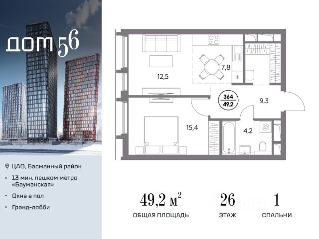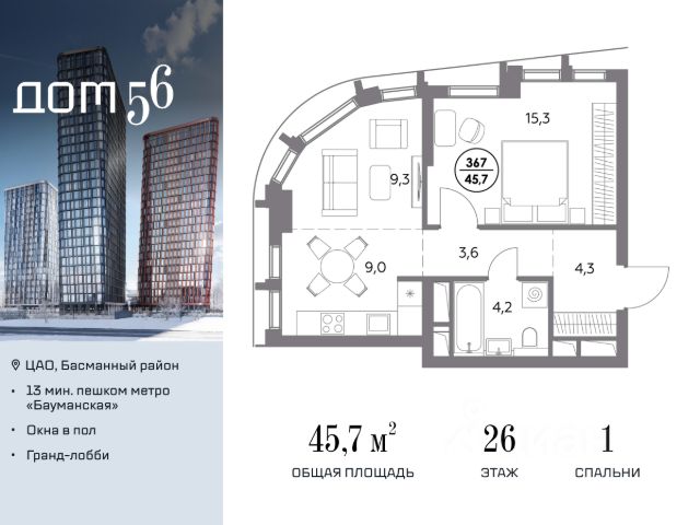 В премиум-квартале "Дом 56" на Бауманской напрямую от девелопера ГК "Галс-Девелопмент" представлена 1-комнатная квартира на 26 этаже общей площадью 45.70 м². Квартира предлагается без отделки, со свободной планировкой. Пространство позволяет воплотить дизайн - проект в соответствии с Вашими предпочтениями. "Дом 56" - расположен в Басманном районе на ул. Фридриха Энгельса, всего в 12-15 минутах пешком от станций метро "Бауманская" и "Электрозаводская". Рядом с премиум-кварталом находятся важные городские магистрали - ТТК, набережная реки Яузы и Бакунинская улица, переходящая в Спартаковскую и Маросейку. Архитектурный стиль "Дома 56" - параметрический минимализм. Футуристические фасады квартала с "эффектом закручивания" словно вращаются вокруг своей оси. Динамичный образ башен дополняет эффектное остекление - окна в пол будут в каждой квартире. "Дом 56" станет органичным продолжением современной научно-креативной среды Басманного района: - Развитое окружение - десятки различных точек притяжения; - Близость престижных вузов: МГТУ, МЭИ и Британская высшая школа дизайна; - Соседство с Технологической долиной и всем необходимым для запуска стартапа; - Набережные и парки для спорта и отдыха. "Дом 56" оснащён первоклассными инженерными системами. Входы на территорию, в здание и паркинг оборудованы системой контроля и управления доступом. С любого этажа в лобби и паркинг спускаются быстрые и бесшумные лифты премиального бренда. Во внутреннем приватном дворе будет создано пространство в бионическом стиле с лаунж-зонами, подвесными качелями, детскими плейхабами для разных возрастов, площадками для спорта и отдыха в окружении зелени. На двух подземных уровнях предусмотрен подземный паркинг и кладовые помещения.