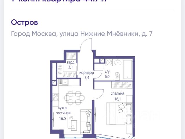Продаётся однокомнатная квартира от застройщика: общая площадь 47.30 м², жилая 13.10 м², кухня 21.30 м², 19, жилой квартал "Остров 7", корпус 7 (7 квартал) (секция 2). срок сдачи: 4-кв. 2025. , 1 совмещенный санузел. В жилой зоне 2 больших окна на одну сторону, хорошая инсоляция. Позвоните сейчас и забронируйте квартиру! Купите квартиру в доме у прибрежного парка, в квартале ОСТРОВ.7. Это семь корпусов премиум- и бизнес-класса в одном из лучших мест ОСТРОВА - между бульваром и парком, поблизости от реки. Стильные корпуса имеют узнаваемый вид благодаря бионической пластике фасадов, приподнятых над землей. Для жителей предусмотрены детский клуб, фитнес-рум, коворкинг, переговорные, лаунжи. На крышах устроены видовые общественные пространства с зонами для отдыха и спорта. Двор расположен на двух уровнях: нижний ландшафтный парк и верхняя городская терраса. ОСТРОВ.7 - часть жилого комплекса на западе Москвы, в 15 минутах езды от центра. Это настоящий заповедник посреди большого города, в окружении реки и 650 га заповедников. Здесь все необходимое находится по соседству: от детского сада до супермаркета, от фитнес-зала до серфинг-центра. На территории созданы все условия для отдыха и общения: клубная инфраструктура в домах и дворы-парки, набережные и променады, маршруты для спортсменов, детей и возрастных жителей. В нескольких минутах ходьбы расположена станция метро "Терехово" БКЛ. На автомобиле - 10 минут до Москва-Сити и 15 минут до Садового кольца.