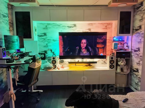 В гостиной, телевизор LG OLED 77 с динамической подсветкой philips, саундбар sennheiser с сабвуфером, на потолке 4 колонки, усилитель pioneer, диван,в углу установлена зона отдыха для котят.