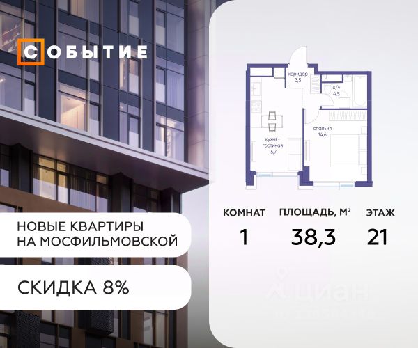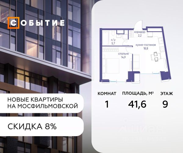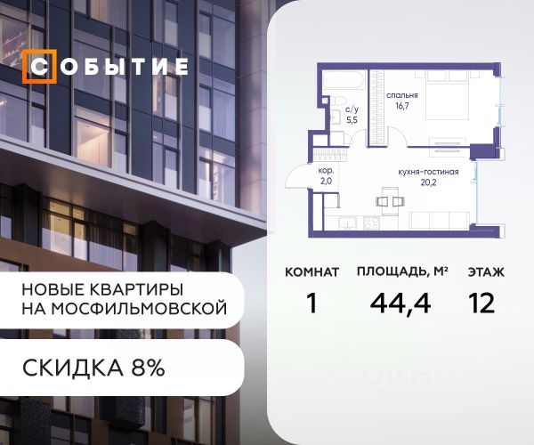 Цена указана с учётом скидки при 100%-й оплате, несубсидированной ипотеке, рассрочке (кроме программы "Рассрочка 0%"). В жилом квартале, расположенном на границе с природным заказником "Долина реки Очаковки", продаётся 1-комнатная квартира площадью 29.20 кв.м с отделкой white box. Квартира расположена на 28 этаже 42-этажного корпуса 10 в жилом комплексе бизнес-класса Левел Мичуринский (компания Level Group/Левел групп). Отличная транспортная доступность: - от 10 мин. пешком до станции метро "Мичуринский проспект" - 15 мин. пешком до станции метро "Аминьевская" - 7 мин. на авто до МКАД - 10 мин. на авто до ТТК - 15 мин. на авто до Москва-Сити Продуманный архитектурный проект: - Выразительная архитектура от известных бюро: корпуса 1-6 - СПИЧ, корпуса 7-13 - Borisov Architects; - Из окон открываются живописные виды на парки, Москва-Сити и МГУ; - Высокие потолки до 6,35 м; - Стильные лобби с окнами в пол и высокими потолками до 4,7 м; - С каждого этажа дома на лифте можно спуститься в подземный отапливаемый паркинг. Расположение: Жилой комплекс Левел Мичуринский строится в одном из самых зелёных районов Москвы - Очаково-Матвеевское. Этот уголок столицы идеален для поддержания здорового образа жизни. В шаговой доступности от проекта находятся заказник "Долина реки Очаковки" - 1 мин. пешком и Очаковский парк - 7 мин. пешком. На велосипеде можно добраться до таких парков, как "Событие", парк Олимпийской деревни, парк 50-летия Октября и парк Школьников. В 15 минутах езды на авто расположено более 30 детских садов (из них 14 в пешей доступности), 32 школы (из них 13 в пешей доступности) и 14 вузов. Также в ближайшем окружении - более 25 медицинских учреждений, 11 спортивных клубов и 22 продуктовых супермаркета. Внутренняя инфраструктура: На территории жилого комплекса строится три детских сада и школа. На первых этажах домов откроется супермаркет, фитнес-центр, ресторан, кафе и другие сервисы. Подземные этажи займут паркинги: трёхуровневые - в этапах 1 и 2, одноуровневый - в этапах 3 и 4. Преимущества проекта: - 4,5 га благоустроенной территории с видовым мостом, уличным кинотеатром, зонами для тихого отдыха, работы, воркаута, площадки для петанка, футбола, настольного тенниса и пляжного волейбола. - Дизайнерские лобби с панорамным видом на двор, мойками для лап животных и комфортными зонами ожидания. - Безопасность жителей: круглосуточное видеонаблюдение всех зон общего пользования (лобби, лифты, паркинги, детские площадки), система контроля доступа, управление видеодомофоном через мобильное приложение, единый ключ доступа на территорию жилого комплекса. - Технологии и комфорт: высокоскоростной Wi-Fi в лобби и на придомовой территории, автоматическая система контроля и учёта ресурсов, абонентская связь с консьержем, распознавание номеров автомобилей при въезде в паркинг и выезде из него.