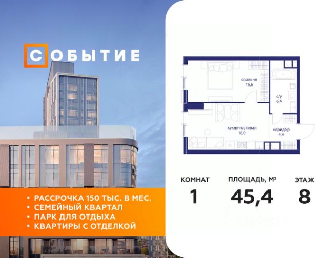 В продаже 1-к квартира от застройщика. Общая площадь 39.30, жилая 14.10, кухня 17.3. Квартира расположена на 12 этаже жилого квартала "Событие-6", корпус 1, Секция 1. Квартира без отделки. Срок сдачи: 4 кв. 2029 года. СОБЫТИЕ.6 — финальный дом парк-квартала СОБЫТИЕ на Мосфильмовской. Переезжайте в уже сформированный квартал с готовой инфраструктурой и парком! Премиальный жилой комплекс в престижном районе Москвы предлагает стильную архитектуру, продуманное благоустройство и великолепно разнообразие общественных пространств. Свой парк прямо возле дома! Архитектура Архитектура СОБЫТИЯ.6 выполнена в ультрасовременном стиле московским бюро Atrium на основе дизайн-кода британских архитекторов LDA Design и UHA London. Дом отличает оригинальная геометрия фасадов, большое остекление и высокие лобби (до 6,2 м) с авторской мебелью и светильниками. Расположение Мосфильмовская улица (Раменки) — один из престижных районов Москвы. Близость к историческому и деловому центру, природным зонам Запада столицы. Транспортная доступность: • 10 мин до Москва-Сити и ТТК; • 15 мин до Садового кольца; • 25 мин до аэропорта Внуково; • 7-10 мин до станций метро "Аминьевская" и "Мичуринский проспект". Инфраструктура: • парк "Событие" (12 га, финалист конкурса Правительства Москвы) с беговыми (1,5 км) и велодорожками (2,7 км), экотропой (1,6 км), площадками, лекторием; • школа, детский сад, магазины, салоны красоты, рестораны (к моменту заселения); • мультидвор с игровыми и спортивными площадками, мини-бульваром; • общественная терраса на 10-м этаже (коворкинг, лаунж); • Закрытые общественные пространства: детская комната, спортивный зал, коворкинг, лаунж-зоны. Паркинг 256 мест для жителей (48 — для электромобилей), 24 гостевых (5 — для электромобилей), мойки колес, кладовые, зоны для велосипедов. Окружение Парки и заповедники (Воробьёвы горы, Матвеевский лес и др.), МГУ, театр им. Н. И. Сац, стадион "Лужники". Безопасность Видеонаблюдение, контроль доступа, видеодомофоны, консьерж-сервис 24/7, системы пожарной безопасности и мультисервисная оптическая сеть.