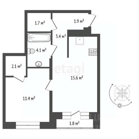 Квартира с кухней-гостиной и одной спальней в квартале "Метроном". Особенности планировки: ипотека 8%, окна в пол, без отделки, мастер-спальня, терраса на крыше. квартиры в нашей базе: КВМ-КВМ02-11-11.2.2.