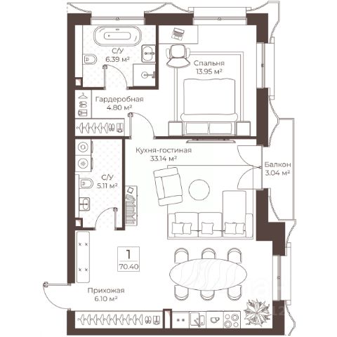 КВАРТИРА: большая светлая комната 19,7 кв.м., установлен кондиционер, кухня 7,8 кв.м., с выходом на просторную лоджию, есть гардеробная. Стена между комнатой и кухней не несущая, газа в доме нет, поэтому можно сделать перепланировку.