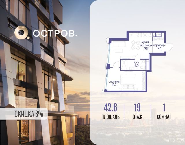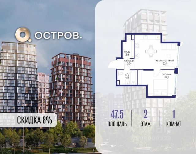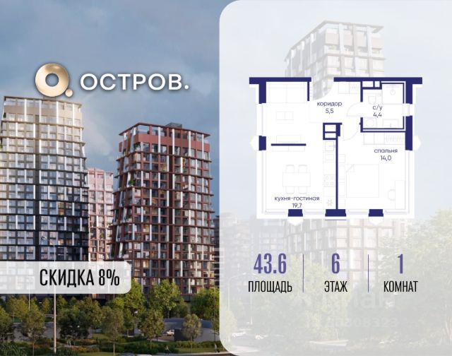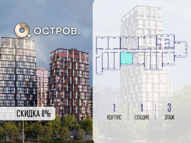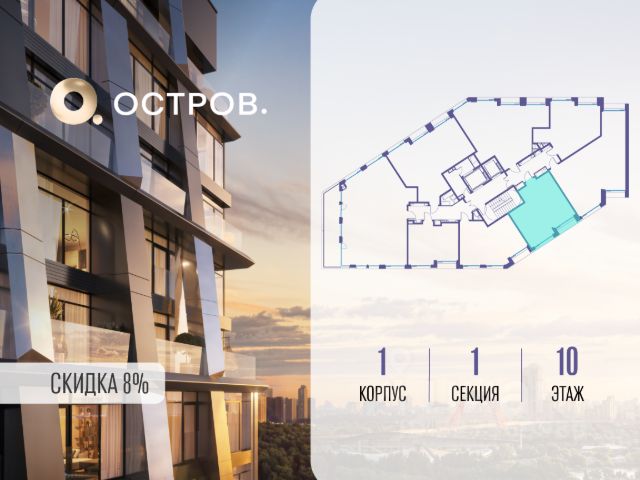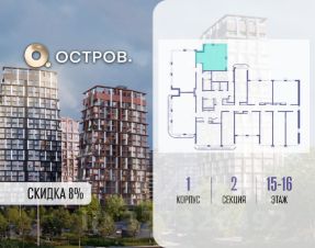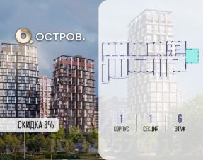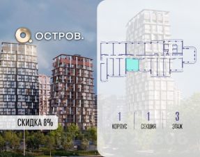 Остров1, общей площадью 42,8 кв. м, расположена в 5 корпусе на 11 этаже.