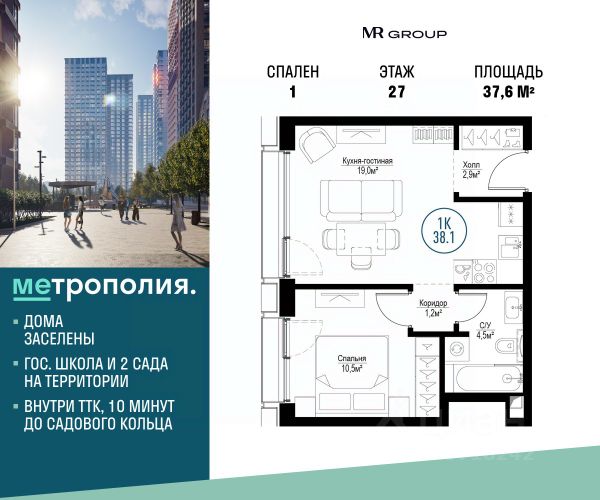 Id 386669. В продаже стильная и уютная однокомнатная квартира площадью 39,7кв.м., распложенная на 10 этаже 30-ти этажного монолитного дома в ЖК бизнес- класса "Метрополия" корпус "Токио", которая состоит из комнаты площадью 12,8 кв.м. и кухни-гостиной площадью 15,7 кв.м.