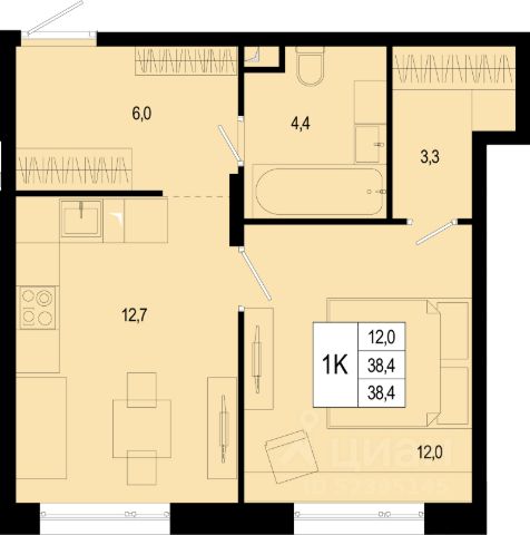 Продаётся 1-комнатная квартира в строящемся доме (Текстильщиков, 45), срок сдачи: I-кв. 2028, общей площадью 38 кв.м., на 1 этаже.