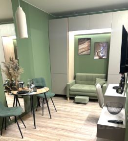 — Планировка: комната совмещена со столовой зоной — простор и гибкость.