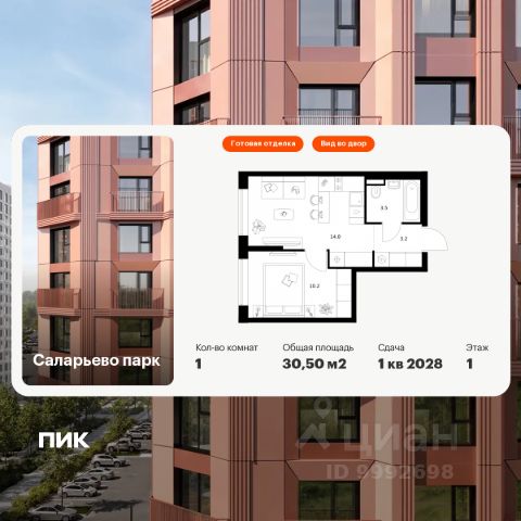 Продается однокомнатная квартира с отделкой в 9 фазе города-парка "Первый Московский". Общая площадь квартиры - 42,2 кв. м, этаж 1 из 19. Срок сдачи - 2 квартал 2027 года. Тип дома - монолитный. Цена указана при 100% оплате. Новый корпус состоит из 3 секций: Все квартиры с отделкой White Box с возможностью дополнительного выбора дизайнерской отделки: Classic или Smart+ Город-парк "Первый Московский" расположен всего в 7 км по Киевскому шоссе (Новая Москва). Из города-парка прямой выезд на Киевское шоссе и трассу Солнцево-Бутово-Варшавское шоссе. ТРАНСПОРТНАЯ ДОСТУПНОСТЬ: - 5 мин. на личном автомобиле или 10 мин. на автобусе 189, 147, 193 до станции метро "Филатов Луг" - 5 мин. на личном автомобиле или 12 мин. на автобусе 863 до станции метро "Саларьево" - 6 мин. на личном автомобиле или 15 мин. на автобусе 333 до станции метро "Рассказовка" РАЗВИТАЯ ИНФРАСТРУКТУРА В ОКРУЖЕНИИ: - общеобразовательная школа 2120 (корпуса д1, д7, ш1-ш5) - детский сад 2120 (корпуса д2, д9) - школа искусств - городская больница, детская поликлиника, филиал 5 - подстанция скорой помощи 58 и пожарно-спасательный центр 313 - отдел полиции, отдел ГИБДД - торговые центры "Столица" и "Новомосковский" - стадион, каток, бассейн - кафе, продуктовые магазины, аптеки, фитнес-центры, салоны красоты и пр. БЛАГОУСТРОЙСТВО: - дворы без машин - разнообразные детские площадки и развивающие комплексы - детские площадки разделены по возрастным группам - максимальная близость корпуса к парку "Филатов луг" - озеленение территории с учетом зонирования, островками для отдыха ОСОБЕННОСТИ АРХИТЕКТУРЫ: - безбарьерные входные группы - велопарковка на -1 этаже - колясочные в каждой входной группе - коммерческие помещения на 1 этаже в трех секциях - кладовые помещения расположены на жилых этажах и на -1 этаже - в каждой секции корпуса - 4 лифта: 2 пассажирских, 2 грузовых - видеонаблюдение установленное в холлах первых этажей, у подъездов и на прилегающей территории АВТОРСКИЙ ДИЗАЙН: Входные группы выполнены по авторскому дизайну, оснащены системой "тёплый пол". В каждой входной группе будет располагаться комфортабельная зона ожидания, почтовые ящики с ячейкой для спама, колясочная, акцентные пуфы и столик.
