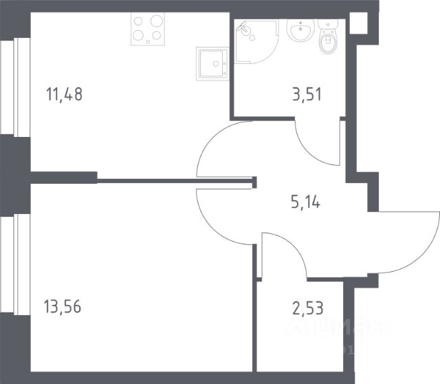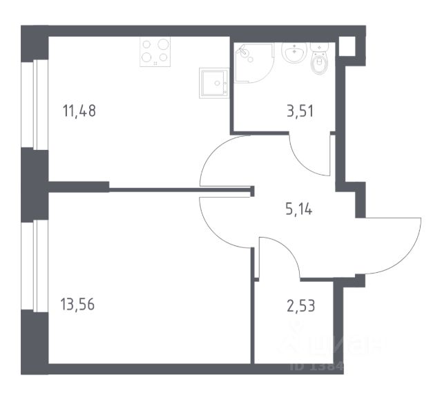 В продаже 1-комнатная квартира в корпусе 13 ЖК 'Эко Бунино'. Квартира располагается на 1 этаже, общая площадь 44.16 м2.