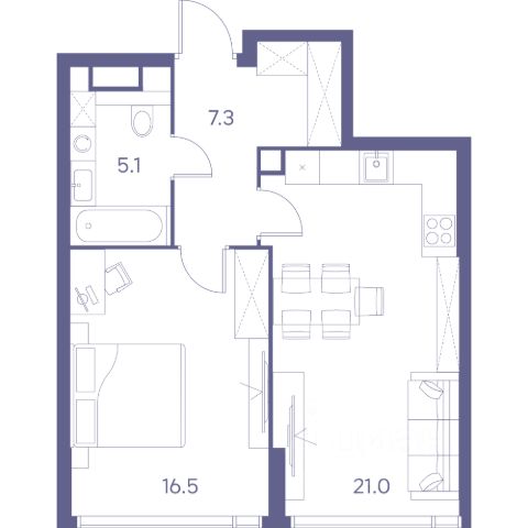 Общая площадь квартиры с балконом (с коэффициентом 0.5 )- 43,05 кв. м., без лоджии по Выписке из ЕГРН- 38.7 . Сейчас свободная планировка, по плану: кухня - гостиная 19 кв.м. с выходом на роскошную террасу, изолированная спальня 11 кв.м., рядом расположен большой с/у - возможно оборудовать мастер- спальню, небольшой коридор.