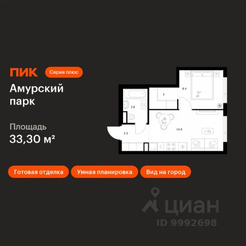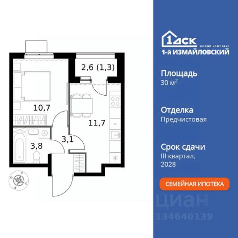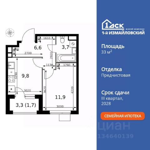 Прямая продажа от застройщика! Жилой Комплекс Комфорт класса. Продаётся 1-к квартира номер 417 общей площадью 33.7 кв.м. на 10-м этаже 10 этажного здания. Предчистовая отделка. Цена с учётом скидки. Особенности квартиры: - Организуем показ в удобное для вас время! - Просторная спальня, в которой можно разместить большую кровать. - Линейная планировка - максимальная функциональность и удобство. - Гибкая планировка - создайте пространство по своему вкусу. - Увеличенная высота потолков - ощущение простора и легкости. - Можно оборудовать рабочее место - комфорт для работы и учёбы. - Линейная кухня - функциональность и практичность в одном решении. - Ниша под шкаф - компактное и удобное место для вещей. - Лоджия - уютное место для отдыха и тишины. - Панорамное остекление лоджии - открывает вид на окружающий мир. Квартира с предчистовой отделкой. Вам не придется заниматься черновыми и трудоёмкими работы, а чистовую отделку и дизайн - сделайте на свой вкус. Информация о комплексе: ЖК "1-й Измайловский" в восточной части Москвы: идеальное место для жизни в окружении 14 000 гектаров леса. Наслаждайтесь лыжными прогулками зимой и пробежками летом в сиреневом саду и лесопарках. Комплекс отгорожен от шоссе застройкой первой линии и садами здоровья. Из окон открываются виды на парк "Лосиный остров" и зеленые дворы. Близость к природе и спортивным объектам создаёт атмосферу здорового образа жизни. Транспортная доступность: Не более 2,5 км до станций метро "Щёлковская" и "Черкизовская" и МЦК "Локомотив". Щёлковское шоссе соединяет квартал с Северо-восточной хордой и МКАД, Центральным автовокзалом и Восточным железнодорожным вокзалом. Две автобусные остановки в паре минут ходьбы и 11 маршрутов общественного транспорта. На автомобиле 3 минуты до СВХ 12 минут до ТТК 15 минут до Садового кольца Внутренняя инфраструктура: ЖК расположен в историческом районе Москвы с развитой инфраструктурой. В шаговой доступности: 6 детских садов (включая собственный на 125 мест), 3 школы, поликлиники, торговые центры и парки. Проект создан для здорового образа жизни: рядом стадионы, спортивные объекты для футбола, баскетбола и конного спорта, а также более 30 км беговых и велодорожек. Всё для активной жизни в окружении зелени и современной инфраструктуры. Квартира с предчистовой отделкой - ваш дизайн без черновых работ