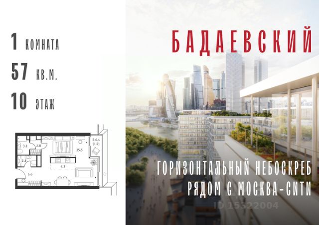 Продаётся 1-комнатная квартира общей площадью 60.00 м² на 10 этаже Жилого Комплекса Бадаевский. О нем говорили. Его ждали. Жилой комплекс "Бадаевский" на Кутузовском проспекте — это место для жизни, которое займет место в истории. Комплекс стал первым в истории московским проектом, победившим в категории Residential на World Architecture Festival. Девелопер Capital Group. В "Бадаевском" исторические здания завода и футуристические "парящие" дома создают единый комплекс, который станет новой достопримечательностью и символом Москвы. Панорамное остекление, террасы и веранды дарят неординарные и захватывающие виды. Благодаря расположению домов и панорамному остеклению, жилые пространства в "Бадаевском" будут наполнены светом. А виды из окон домов-"лент" на Москву-реку, пивоваренный завод, небоскребы "Москва-Сити" и Белый дом дополнены принципиально новым ощущением высоты. На территории Бадаевского завода появится масштабный ландшафтный парк с концепцией "русский лес". Впервые в истории района Дорогомилово у жителей появится прямая связь набережной Тараса Шевченко с Кутузовским проспектом. Близость Москвы-реки добавляет к преимуществам "Бадаевского" природную энергетику и приятные прогулки на свежем воздухе. Подземная парковка позволит сделать территорию завода полностью пешеходной, а сам комплекс представит новый подход к организации открытого и уединенного пространства в центре Москвы. Расположение в начале Кутузовского проспекта делает проект не только престижным, но и удобным: до Третьего транспортного и Садового кольца можно доехать за 5 минут, а Кремль и основные исторические достопримечательности расположены в 15 минутах на автомобиле. Напротив "Бадаевского" находится офисный кластер "Москва-Сити". Для жителей комплекс будет создано не только новое масштабное благоустройство, но и вся необходимая инфраструктура. В исторических корпусах появятся магазины, бутики, кафе и рестораны, коворкинг и крафтовая пивоварня, а в зданиях элеваторов — русская баня. Кроме того, запланирован фермерский рынок и досуговый кластер с музыкальной студией, центром детского творчества и фитнес-центром с бассейном.