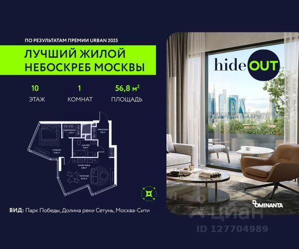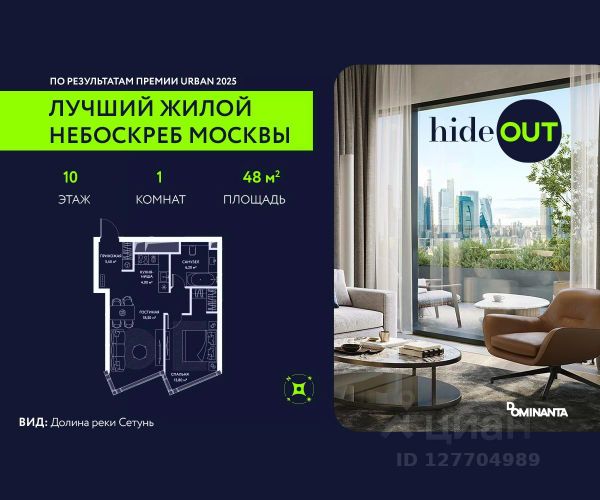 Прямая продажа от застройщика. Продается 1-комнатная квартира площадью 45,9 кв.м. на 10-м этаже 34-этажного дома в ЖК hideOUT с панорамными видами: Во двор. Высота потолков 3,25 м. hideOUT — премиальный проект компании Dominanta. Это новый уровень жизни и комфорта без компромиссов. Две башни — 34 и 49 этажей — открывают захватывающие виды на Москву. Архитектурной доминантой проекта становится мост, соединяющий башни на высоте 80 метров. Закрытая территория, охрана 24/7, зона экстренной безопасности на подземном уровне, система пожаротушения. На мосту между башнями на 22-м этаже находится SocialHUB — предусмотрено 16 комфортных пространств для работы, отдыха и развлечений с панорамными видами и клубным форматом доступа. Концепция благоустройства hideOUT — баланс между природой и технологичным городом будущего. На территории сада предусмотрены 15 зон для отдыха, работы, спорта и детей. Знаковым местом станет центральная площадь с амфитеатром и водопадом — сочетание камней, растений и струящейся воды создает идеальный баланс с природой. В проекте действуют привлекательные условия покупки: - семейная ипотека на старых условиях - успейте вдвое больше до 31.01.2026. - скидка до 20% при 100% оплате стоимости лота и ипотеке без субсидирования. Предложение действует до 31.01.2026. - рассрочка 0% на 3 года с первоначальным взносом от 20%. Период рассрочки до 36 месяцев. Застройщик АО "СЗ "ХАЙДАУТ", ИНН 7729058636, ОГРН 1027739319420. Проектная декларация на сайте наш.дом.рф. Предложение не является публичной офертой.