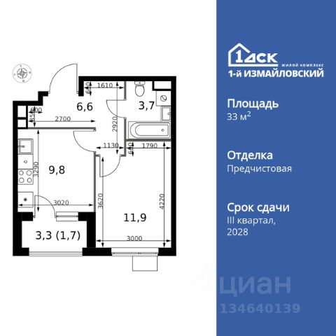 УСПЕЙ ПО СЕМЕЙНОЙ ИПОТЕКЕ БЕЗ НАЦЕНКИ! Квартиры в Москве от 46 000 рублей в месяц! Прямая продажа от застройщика! Жилой Комплекс Комфорт класса. Продаётся 1-к квартира номер 417 общей площадью 33.7 кв.м. на 10-м этаже 10 этажного здания. Отделка Whitebox. Цена с учётом скидки. Особенности квартиры: - Просторная спальня, в которой можно разместить большую кровать. - Линейная планировка - максимальная функциональность и удобство. - Гибкая планировка - создайте пространство по своему вкусу. - Увеличенная высота потолков - ощущение простора и легкости. - Можно оборудовать рабочее место - комфорт для работы и учёбы. - Линейная кухня - функциональность и практичность в одном решении. - Ниша под шкаф - компактное и удобное место для вещей. - Лоджия - уютное место для отдыха и тишины. - Панорамное остекление лоджии - открывает вид на окружающий мир. Квартира с предчистовой отделкой (White box). Вам не придется заниматься черновыми и трудоёмкими работы, а чистовую отделку и дизайн - сделайте на свой вкус. Информация о комплексе: Современный архитектурный проект "1-й Измайловский" - идеальное место для проживания, расположенное в восточной части Москвы в окружении 14 000 гектаров леса. Комплекс пронизан атмосферой здорового образа жизни и благополучия. Сиреневый сад и близлежащие лесопарки - это места, где можно насладиться лыжными прогулками зимой и тонизирующими пробежками летом. Расположенный между Щелковским шоссе и Амурской улицей, "1-й Измайловский" осмысляет себя не столько через близость к городским точкам притяжения, сколько через соседство с зелеными пространствами и спортивными объектами. Он отгорожен от шоссе застройкой первой линии и собственными садами здоровья. В его окнах - изумрудное море парка "Лосиный остров" и густые кроны окрестных дворов. В его графике - занятия спортом и прогулки в Измайлове. Транспортная доступность: Не более 2,5 км до станций метро "Щёлковская" и "Черкизовская" и МЦК "Локомотив". Щёлковское шоссе соединяет квартал с Северо-восточной хордой и МКАД, Центральным автовокзалом и Восточным железнодорожным вокзалом. Две автобусные остановки в паре минут ходьбы и 11 маршрутов общественного транспорта. На автомобиле 3 минуты до СВХ 12 минут до ТТК 15 минут до Садового кольца Внутренняя инфраструктура: Комплекс находится в исторически сложившемся районе Москвы с хорошим качеством и плотностью инфраструктуры. Торговые центры и сетевые магазины -6 детских садов, включая собственный детский сад на 125 мест -3 школы, включая собственную школу -Поликлиники и медицинские центры -Парки и зоны отдыха Расположение архитектурного проекта создает все условия для тех, кто стремится к здоровому образу жизни и для тех, кто уже сделал выбор в его пользу. В ближайшем окружении расположены несколько стадионов и множество спортивных объектов для занятий спортом на любой вкус: от всеми любимого футбола, баскетбола и до конного спорта. В окружении проекта более 30 километров организованных бегов