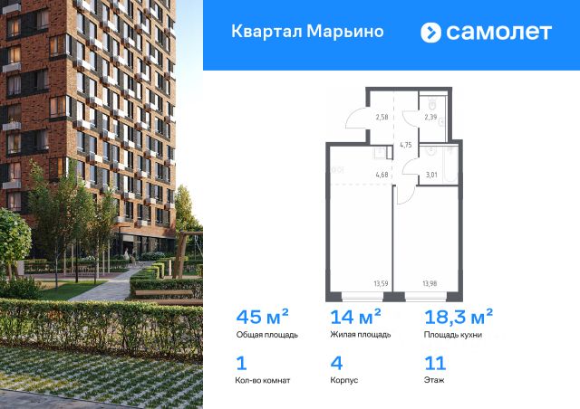 Продажа 1-комнатных квартир на 11 этаже рядом с метро Саларьево