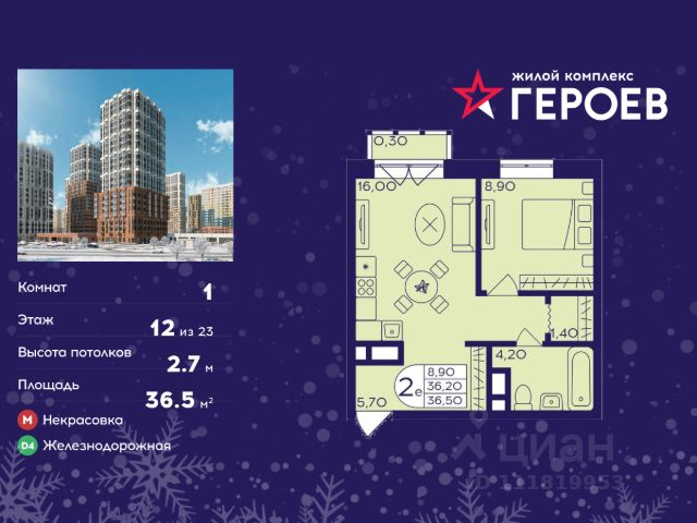 Продаётся 1-комнатная квартира в сданном доме (проспект Героев, 12 (Корпус 306)), срок сдачи: III-кв. 2022, общей площадью 37.3 кв.м., на 12 этаже. Расположение в самом центре города обеспечивает доступ к богатой торговой, развлекательной, социальной инфраструктуре Железнодорожного. При этом собственная инфраструктура микрорайона сделает "Центр-2" не только географическим, но и общественным центром жизни города Железнодорожный. Территория микрорайона делится на две части широким благоустроенным бульваром. На первых этажах домов расположатся магазины, кафе, рестораны, точки сервисного обслуживания, салоны красоты. Для жителей микрорайона "Центр-2" свои двери откроют две школы и два детских сада, детская и взрослая поликлиники, музыкальная школа, спортивно-оздоровительный комплекс. В настоящее время уже открыты и успешно функционируют общеобразовательная школа и детский сад. Внутренние территории микрорайона благоустроены и оборудованы зонами отдыха, детскими, игровыми и спортивными площадками. Для автомобилистов предусмотрены автостоянки. Время в пути личным автотранспортом от ЖК "Центр-2" составляет порядка 35-40 минут центра Москвы . Дорога до Курского вокзала от платформы "Железнодорожная" на электропоезде "Спутник" занимает всего 23 минуты. Добраться до станции пешком жители ЖК "Центр-2" могут за 15 минут, городским транспортом — за 5-7 минут. Рейсовые автобусы и маршрутные такси связывают микрорайон со станциями метро "Выхино" (100), "Новокосино" и "Новогиреево" (142), время в пути — 25-40 минут. В 2018 году в 10-минутной доступности от ЖК "Центр-2" открывается станция метро "Некрасовка".